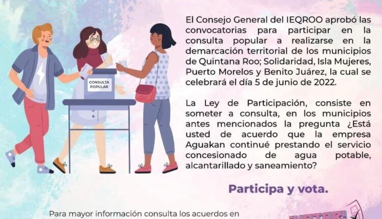 El Instituto Electoral de Quintana Roo incluirá dentro de la jornada electoral del 5 de junio del 2022, una boleta para que la ciudadanía participe en la toma de decisiones y se pronuncie respecto a la continuidad o no de la empresa de agua potable Aguakan en los municipios de Solidaridad, Benito Juárez, Isla Mujeres y Puerto Morelos.