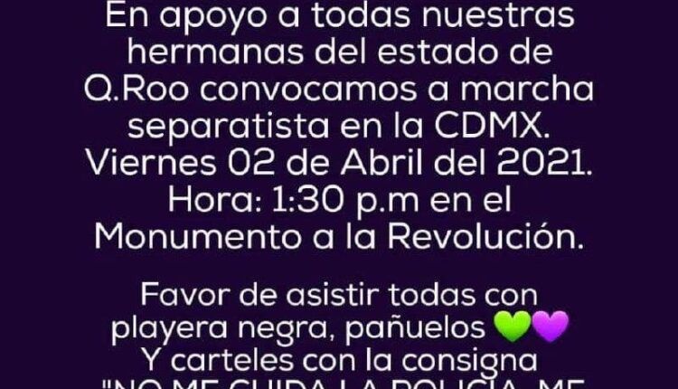A manera de solidaridad, apoyo y para exigir justicia por las recientes muertes de mujeres en el estado de Quintana Roo, desde ayer, diversas colectivas a nivel nacional han convocado a una marcha separatista en la Ciudad de México.