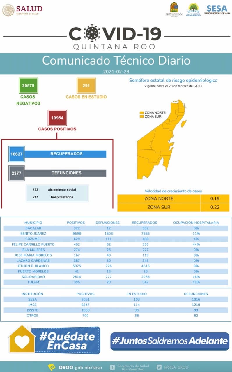 Hay 19 mil 954 casos acumulados en Quintana Roo.