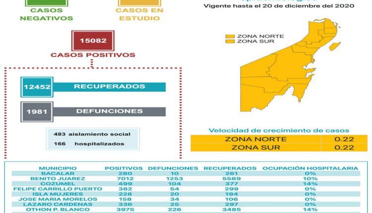 Hasta las 13 horas del 15 de diciembre, se han notificado mil 981 defunciones y 15 mil 82 casos positivos, notificó la Secretaría de Salud del estado a través de su cuenta de Twitter.