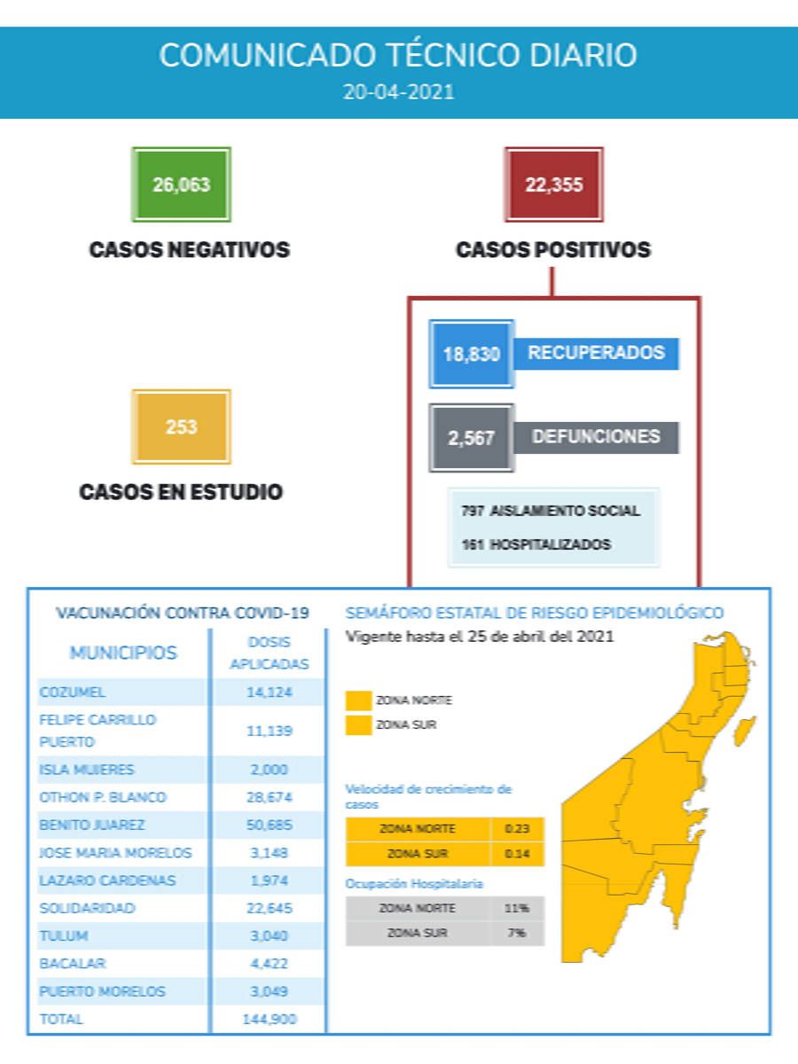 La secretaria de Salud del estado de Quintana Roo Alejandra Aguirre, informó que hay hasta el momento 22, 355 casos positivos, 26,063 casos negativos, y 253 en estudio