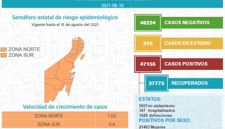 La Secretaría de Salud de Quintana Roo emitió el informe diario de Covid 19, donde señala que hasta este martes 10 de agosto, hay en el estado 47 mil 155 casos positivos, 48 mil 224 casos negativos, 37 mil 773 casos recuperados y 310 casos en estudio.