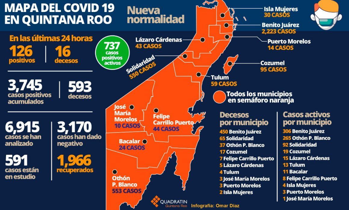 Quintana Roo inició el mes de julio con 126 nuevos casos de Covid 19 y 16 decesos. En total el estado acumula tres mil 745 contagios, 593 muertes, mil 966 recuperados y 591 casos están en estudio, informo este miércoles la Secretaría de Salud estatal.