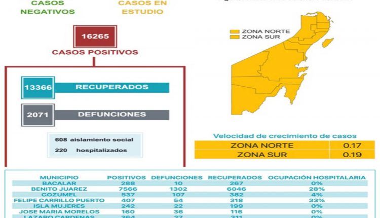 El municipio de Bacalar cuenta hasta el momento con 288 casos, Benito Juárez 7566, Cozumel 537, Felipe Carrillo Puerto 407, Isla mujeres 242, José María Morelos 160, Lázaro Cárdenas 364, Othón P. Blanco 4306, Puerto Morelos 39,Solidaridad 2029,Tulum 327.