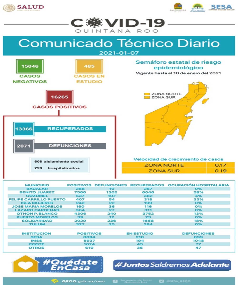 Hasta el 07 de enero del 2021, se han notificado 2 mil 71 defunciones y 16 mil 265 casos positivos.