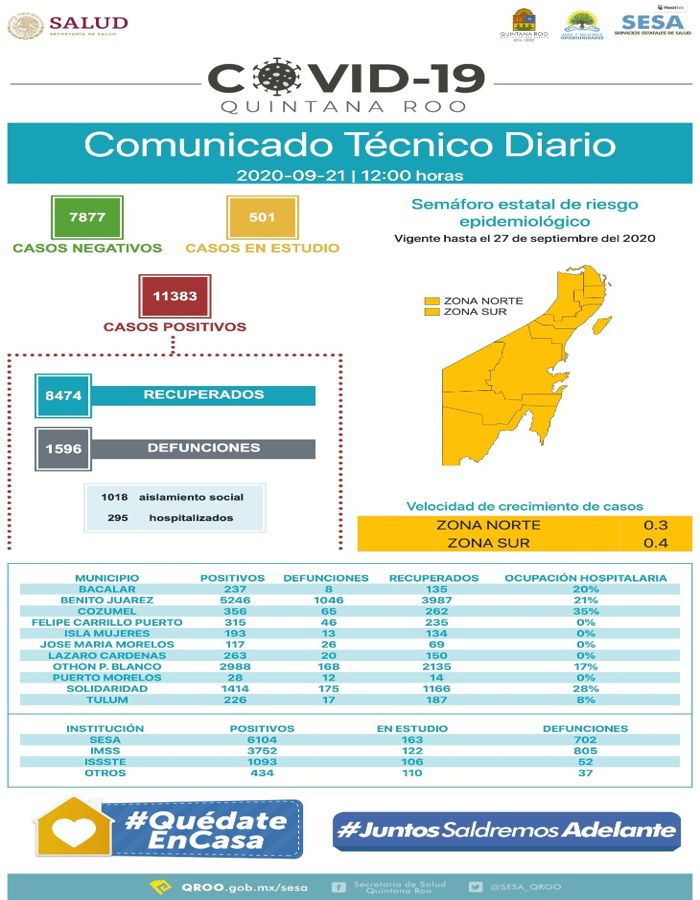 Hasta las 12 horas del 21 de septiembre, se han notificado 8 mil 474 personas recuperadas, 7 mil 877 casos negativos, 501 casos en estudio, 11 mil 383 casos positivos y mil 596 defunciones relacionadas a COVID-19. Así lo informó Alejandra Aguirre, secretaria de salud de Quintana Roo.
