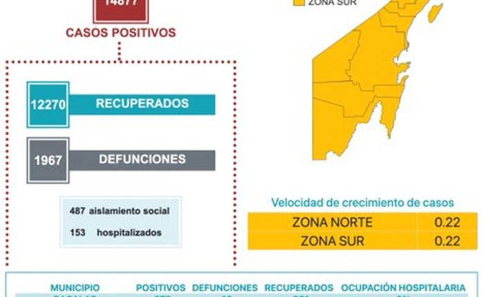 Bacalar cuenta hasta hoy con 279 casos positivos, Benito Juárez 6913, Cozumel 495, Felipe Carrillo Puerto 376, Isla Mujeres 226, José María Morelos 156, Lázaro Cárdenas 332, Othón P. Blanco 3914, Puerto Morelos 35, Solidaridad 1849, y Tulum 302.