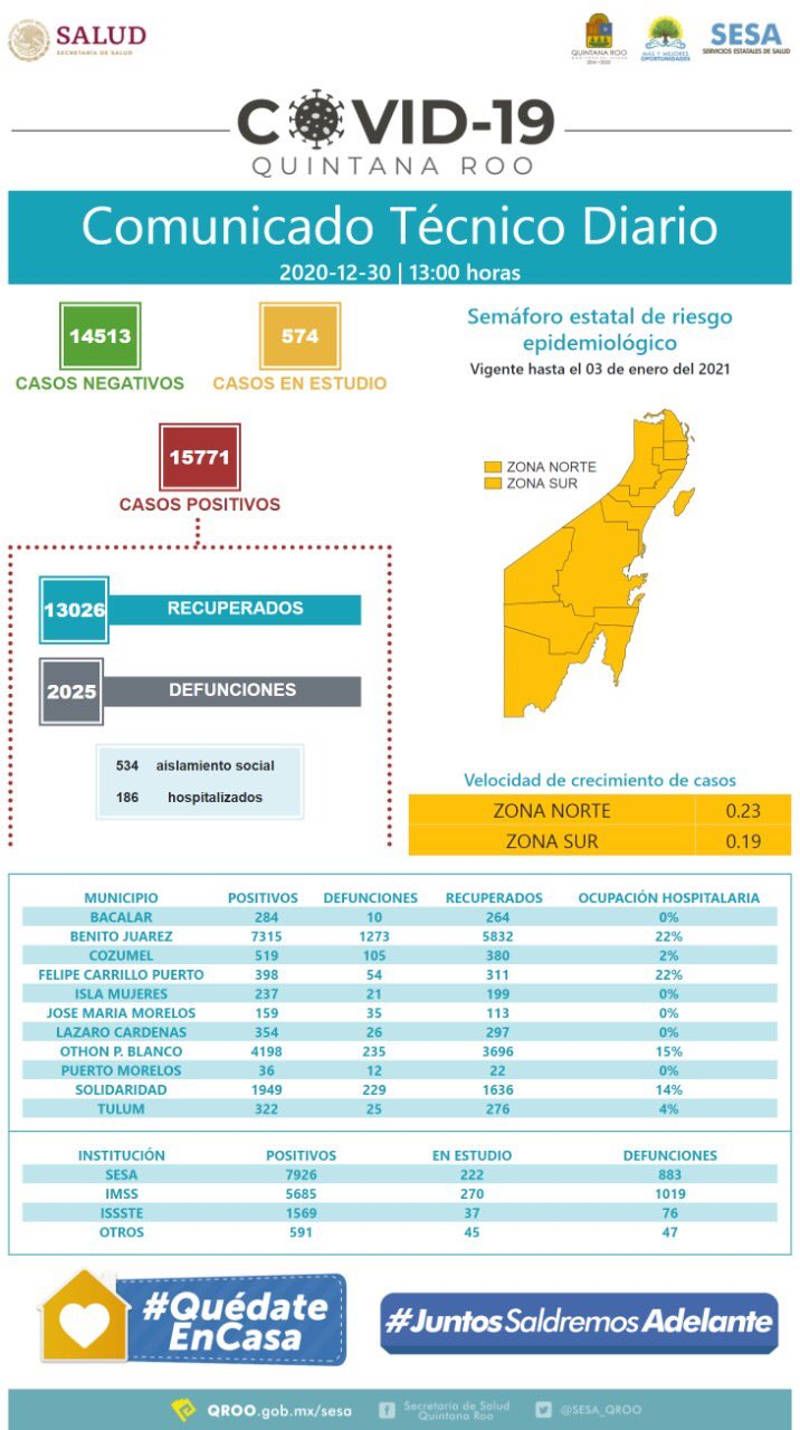 Llega Quintana Roo a 15 mil 771 casos positivos.