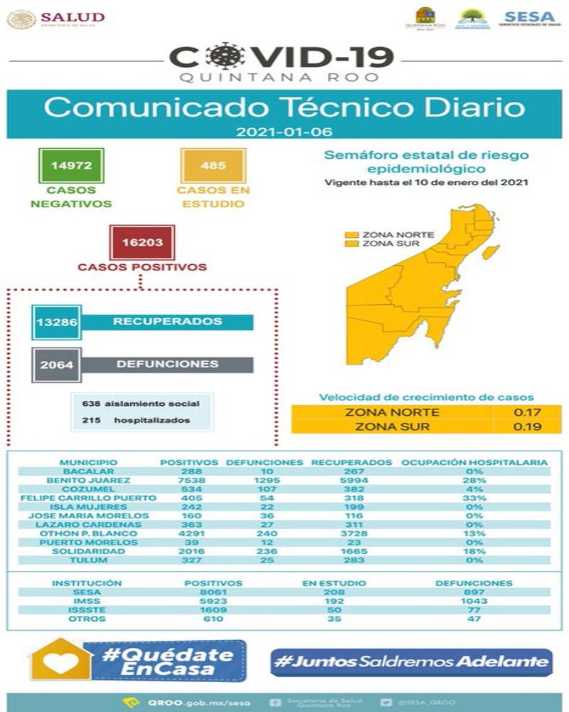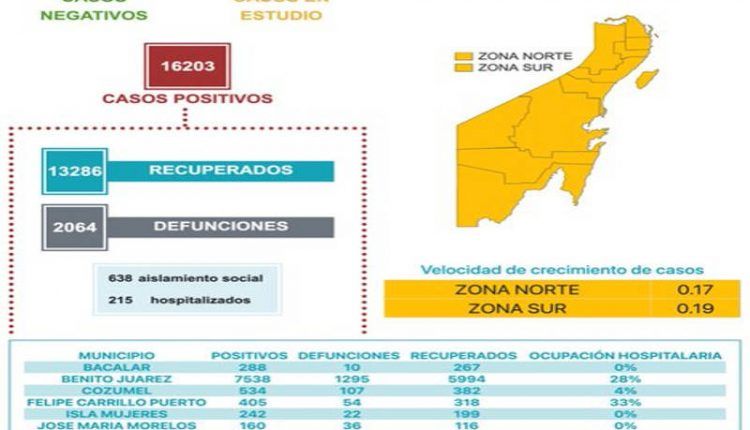 Bacalar tiene 288 casos positivos, Benito Juárez 7538, Cozumel 534, Felipe Carrillo Puerto 405, Isla Mujeres 242, José María Morelos 160, Lázaro Cárdenas 363, Othón P. Blanco 4291, Puerto Morelos 39, Solidaridad 2016 y Tulum 327.