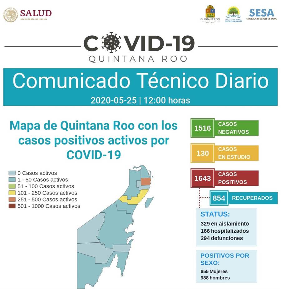 Hasta las 12 horas del 25 de mayo, se han notificado 1516 casos negativos, 130 en estudio, 1643 positivos, 294 defunciones y 854 personas recuperadas a COVID-19.#QuédateEnCasa pic.twitter.com/vKDRH1mS0r