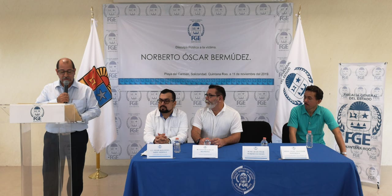 El Fiscal General del Estado, Mtro. Óscar Montes de Oca Rosales, fue representado por Julio César Moreno Orendain, Vicefiscal de la Riviera Maya, quien ofreció la disculpa pública al C. Norberto Óscar Bermúdez y a su menor hijo.
