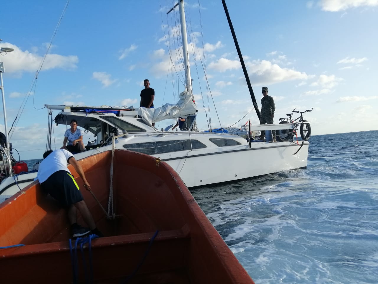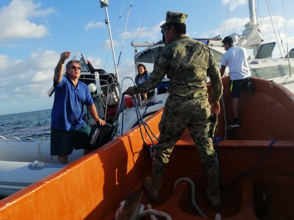 Por lo anterior, se ordenó el zarpe inmediato de una embarcación menor de la Armada de México, logrando ubicar dicho velero con sus dos tripulantes a bordo, encontrándose en buen estado de salud, a quienes se brindó el apoyo para poner a flote citada embarcación y remolcarla a un área de mayor profundidad para continuar con su navegación.