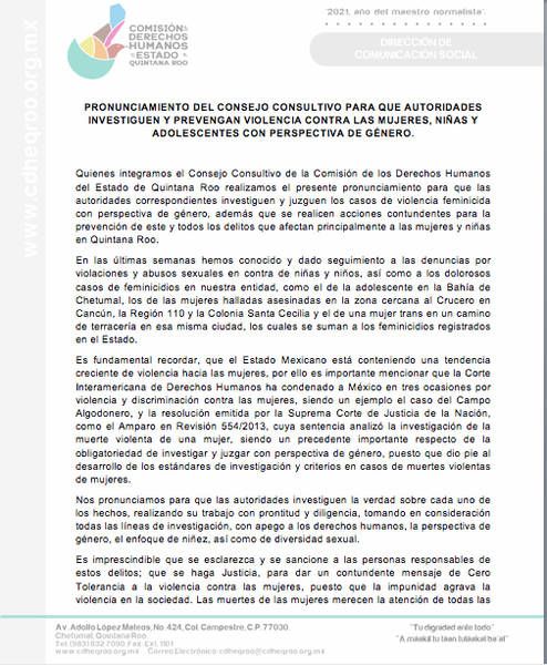 Quienes integramos el Consejo Consultivo de la Comisión de los Derechos Humanos del Estado de Quintana Roo realizamos el presente pronunciamiento para que las autoridades correspondientes investiguen y juzguen los casos de violencia feminicida con perspectiva de género, además que se realicen acciones contundentes para la prevención de este y todos los delitos que afectan principalmente a las mujeres y niñas en Quintana Roo.
