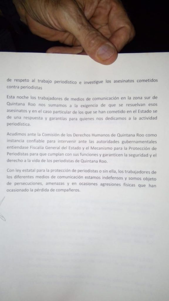 El colectivo de periodistas de Quintana Roo emitió un comunicado dirigido al Presidente de la República Andrés Manuel López Obrador, a las autoridades estatales del gobierno de Quintana Roo, así como al H. Congreso del Estado, condenando el asesinato de los tres periodistas ocurridos en días pasados en los estados de Morelos, Guerrero y Veracruz, y exigiendo que pare el hostigamiento, persecución, acoso, intimidación y amenazas en contra de las y los periodistas en México.