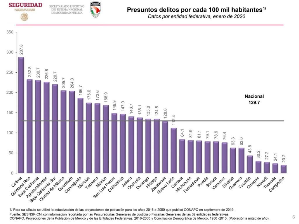 El estado de Quintana Roo es el segundo lugar nacional en delitos denunciados por cada 100 mil habitantes durante enero de 2020 según las cifras del Secretariado Ejecutivo del Sistema Nacional de Seguridad Pública, esto debido a que durante el primer mes de este año, se denunciaron 4 mil 12 presuntos delitos en el estado, ubicándose el estado caribeño sólo por debajo de Colima en este rubro y superando a Baja California, Aguascalientes e incluso la Ciudad de México.