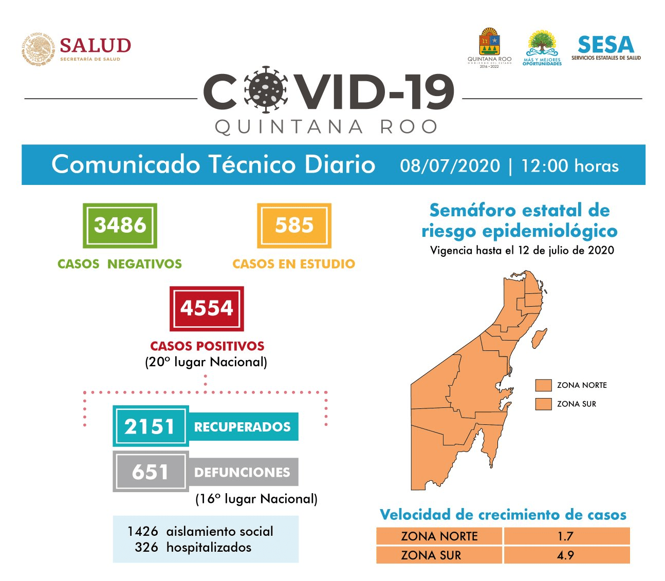 En su reporte diario sobre el Covid-19 en el estado de Quintana Roo, la Secretaria de Salud en la entidad, Alejandra Aguirre, confirmó que hasta las 12 horas del 8 de julio, se han notificado 3486 casos negativos, 585 en estudio, 4554 positivos, 651 defunciones y 2151 personas recuperadas a COVID-19.