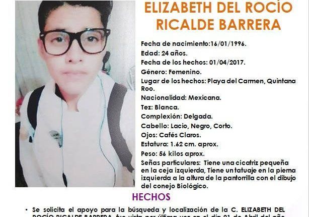 La Fiscalía General del Estado emitió el 31 de diciembre del 2020, una alerta de protocolo Alba para dar a conocer la búsqueda de Elizabeth del Rocío Ricalde Barrera, desaparecida en abril del 2017 cuando trabajaba en el Hotel Hard Rock del municipio de Solidaridad.