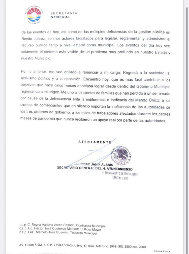 Renuncia Issac Janix tras represión policíaca. El ahora ex secretario de Gobierno del municipio de Benito Juárez, renunció al cargo la mañana de este martes 10 de noviembre, horas después de la represión policíaca contra manifestantes que exigían justifica por el feminicidio de Alexis, de 20 años, así como también por las agresiones contra reporteros que cubrían el evento.