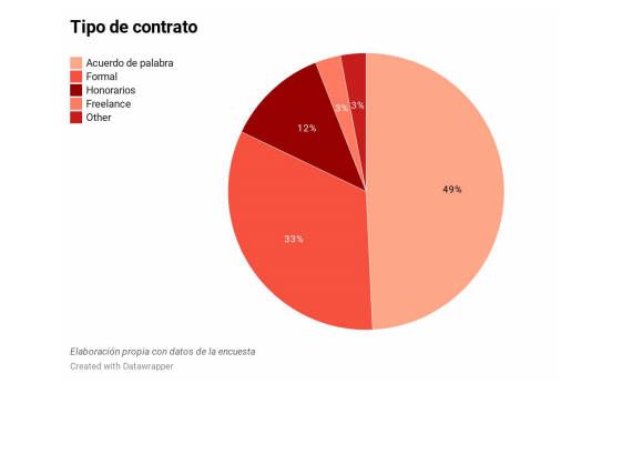 Otro 12.1% (8 encuestados) trabaja bajo un esquema de honorarios y el 4.5% (3encuestados) restante dijeron tener un acuerdo por “colaboración”, ser “freelance” o no recibir pago alguno (sin que brindaran más información al respecto).
