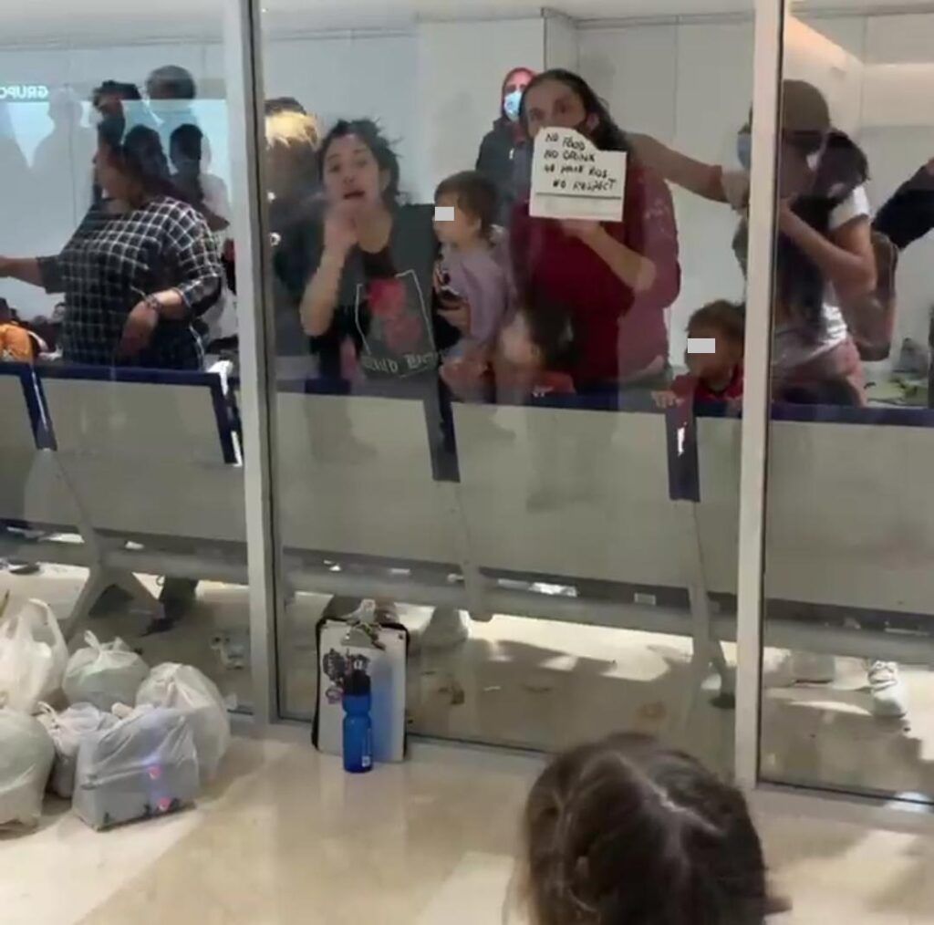 En las imágenes se puede apreciar a estos ciudadanos con carteles haciendo saber su situación a los cientos de turistas que transitan cada hora por los pasillos de llegadas internacionales del aeropuerto de Cancún.