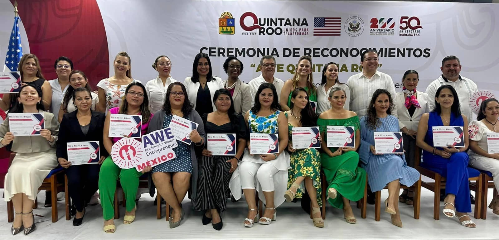 Cancún.- El Gobierno del Estado a través de la Secretaría de Desarrollo Económico y en coordinación con la Embajada de Estados Unidos, la Oficina de Asuntos Educativos y Culturales (ECA) del Departamento de Estado y la Academia para Mujeres Emprendedoras (AWE por sus siglas en inglés) logró que 13 féminas concluyan su capacitación que les permite potenciar y hacer más sostenibles sus empresas.