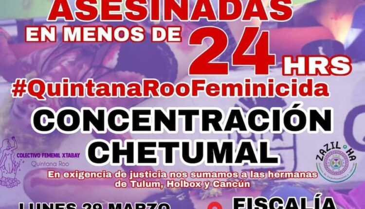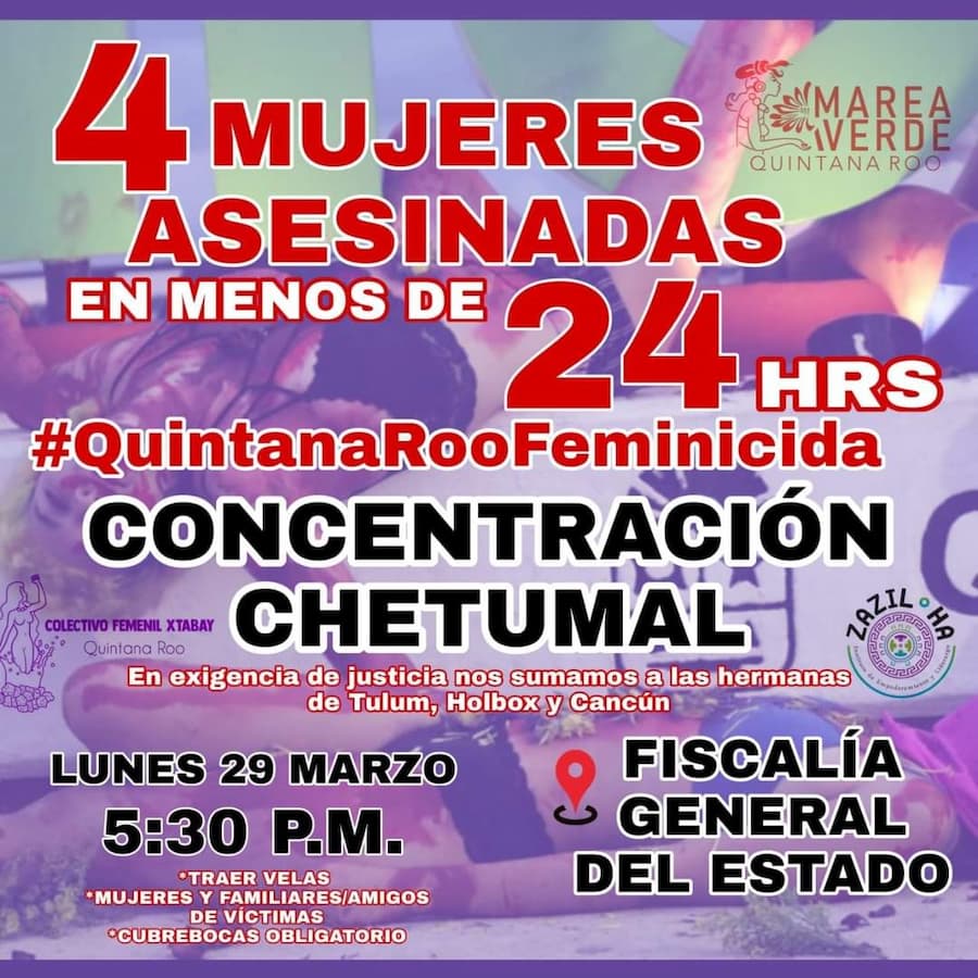 Marea Verde Quintana Roo, convocó a una concentración este lunes 29 de marzo a las 5:00 de la tarde en Chetumal en la Fiscalía General del Estado para exigir justicia por estos asesinatos.