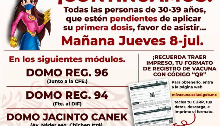 Este jueves 8 de julio continúa la aplicación de la primera dosis de la vacuna AstraZeneca para las personas de 30 a 39 años en el municipio de Benito Juárez.