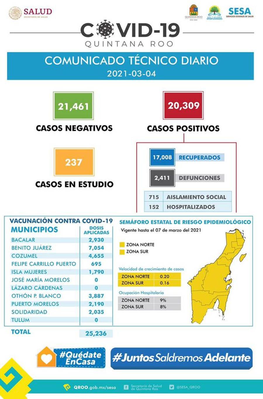 La Secretaria de Salud de Quintana Roo informó que hasta el 04 de marzo de 2021, se han confirmado 20 mil 309 casos positivos, 715 se encuentran en aislamiento social y 152 hospitalizados.