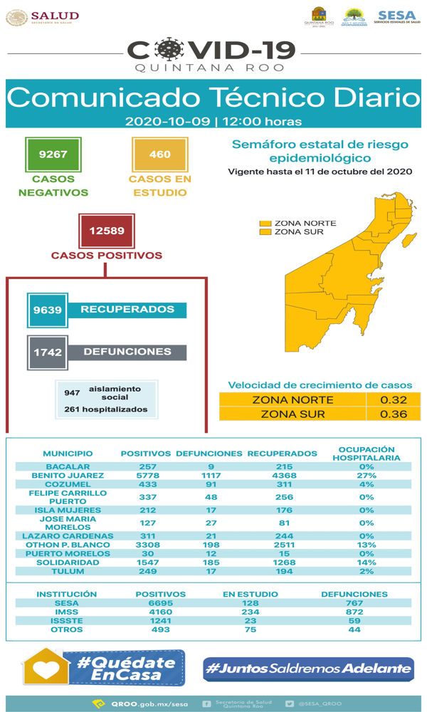 La Secretaría de Salud de Quintana Roo informó que hasta las 12 horas del 09 de octubre, se han notificado 9 mil 639 personas recuperadas, 9 mil 267 casos negativos, 460 casos en estudio, 12 mil 589 casos positivos y mil 742 defunciones relacionadas a COVID-19.