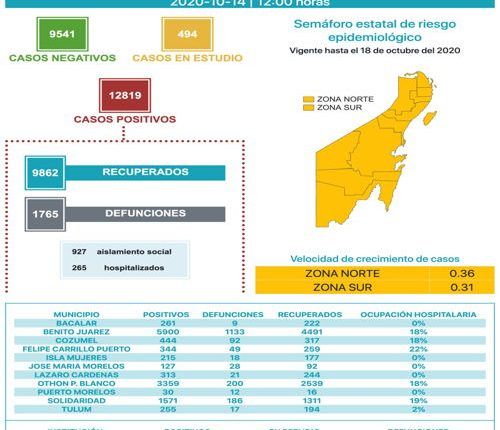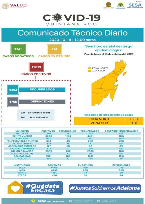 La Secretaría de Salud del estado informó esta tarde que suma Quintana Roo 12 mil 819 casos de Covid-19