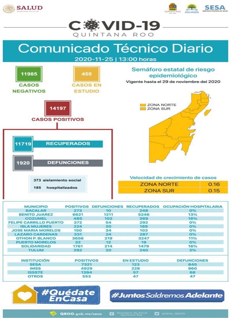 Bacalar tiene 273 casos positivos, Benito Juárez 6621, Cozumel 485 Felipe Carrillo Puerto 372, Isla Mujeres 224, José María Morelos 150, Lázaro Cárdenas 331, Othón P. Blanco 3656, Puerto Morelos 32, Solidaridad 1761, y Tulum 292.