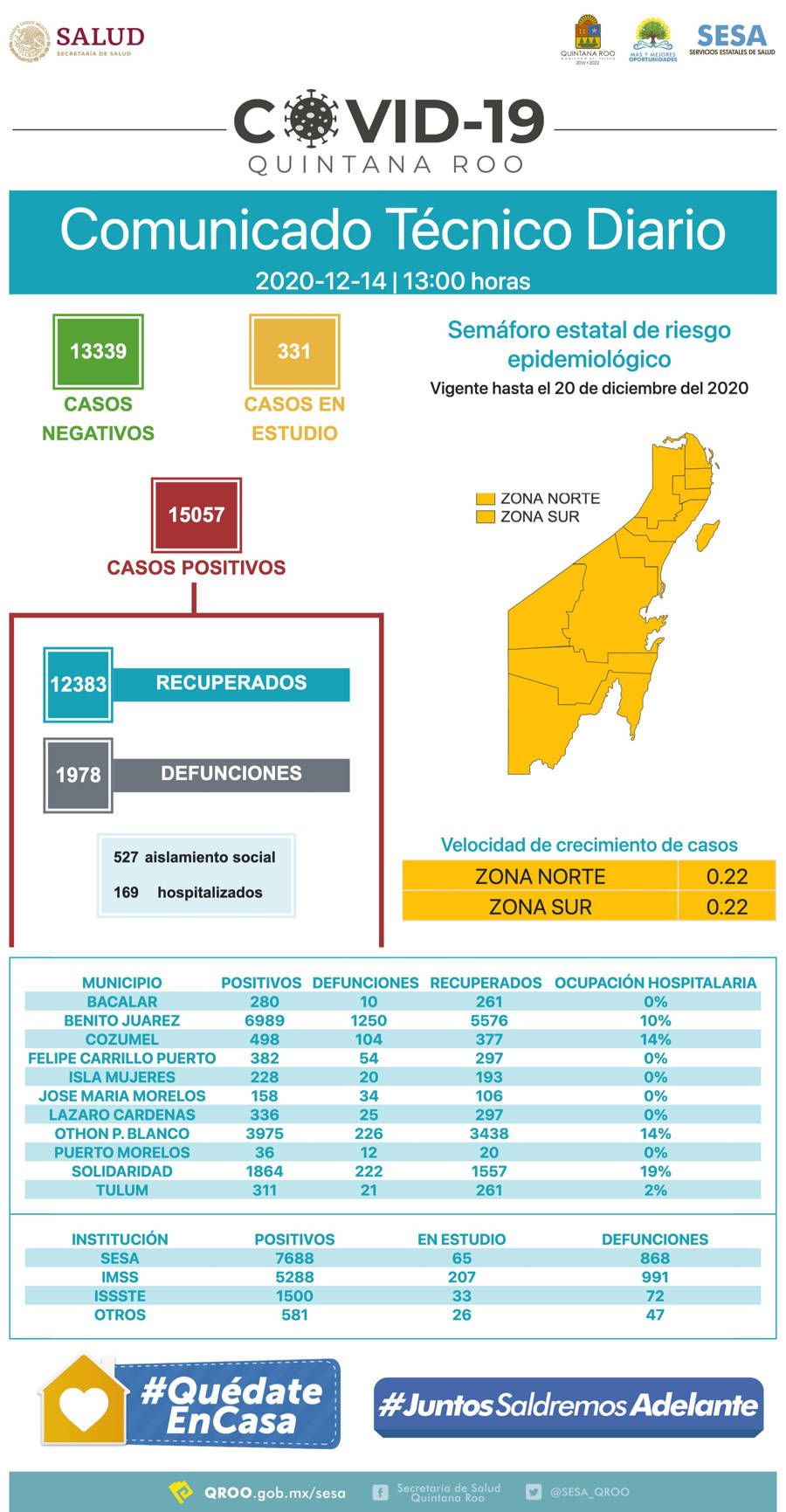 La Secretaría de Salud de Quintana Roo informó por medio de su cuenta de Twitter que hasta las 13 horas del 14 de diciembre, se han notificado mil 978 defunciones y 15 mil 57 casos positivos.