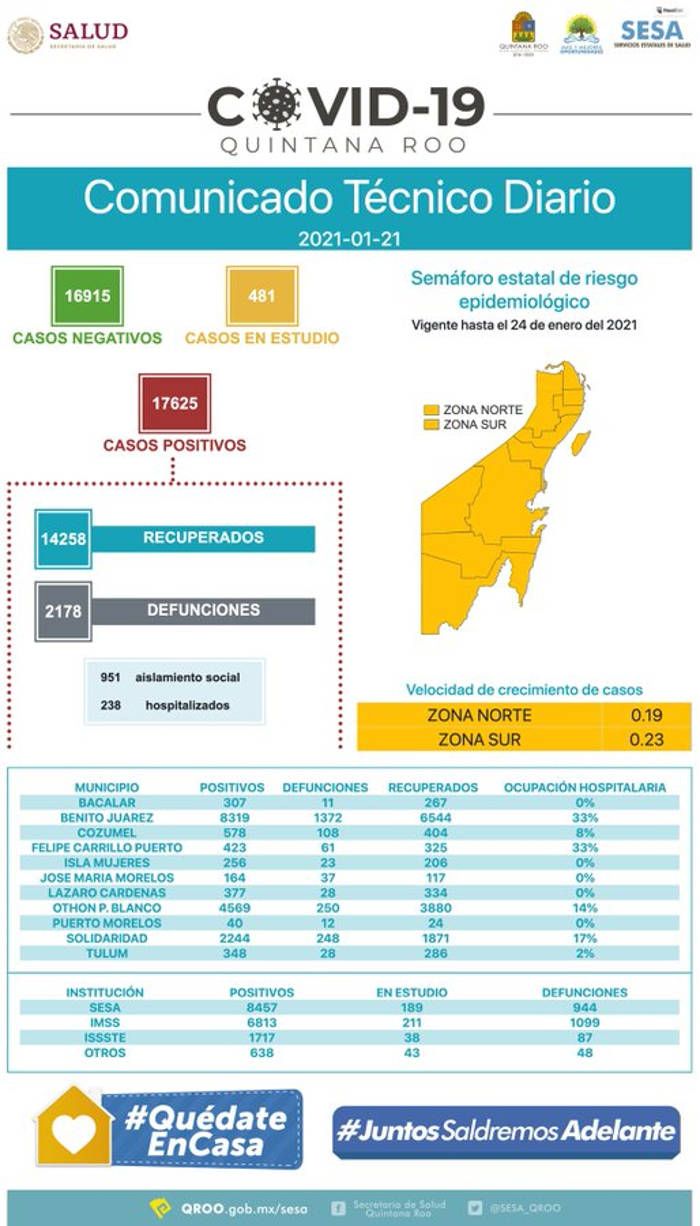 Suma Quintana Roo 17 mil 625 casos positivos.