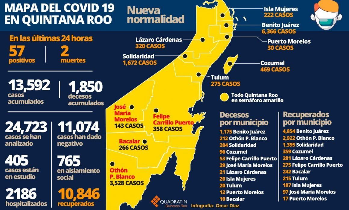 SESA reporta que el número enfermos aislados bajo de 777 a 765, los hospitalizados son 186 y la cifra de las personas que están en estudio bajó de 437 a 405. Benito Juárez acumula mil 175 defunciones; Chetumal, 212; Solidaridad, 204; Cozumel, 96; Felipe Carrillo Puerto, 53; José María Morelos, 29; Lázaro Cárdenas, 21; Isla Mujeres, 20; Tulum igual con 20; Puerto Morelos, 12 y Bacalar, 10.