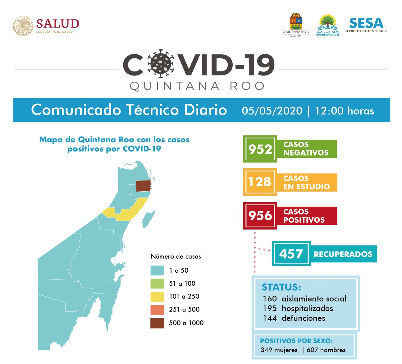 Hasta las 12 horas del 5 de mayo, se han notificado 952 casos negativos, 128 en estudio, 956 positivos, 144 defunciones y 457 personas recuperadas a COVID-19.#QuedateEnCasa pic.twitter.com/uWPOt3xeXA