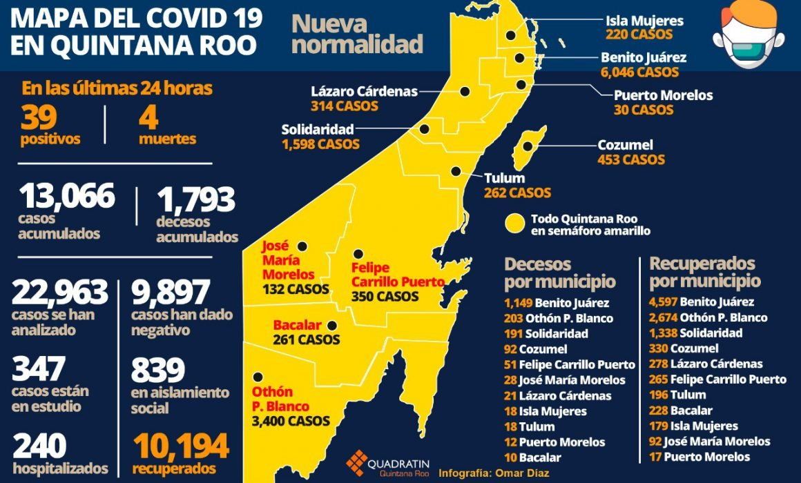 Hasta este lunes 19 de octubre Quintana Roo acumula 13 mil 66 casos positivos de Covid 19, mil 793 defunciones y 10 mil 194 recuperados.