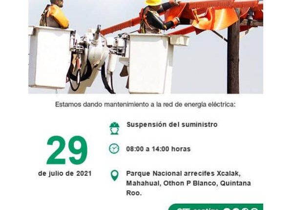 Para dar mantenimiento y mejorar el servicio de energía eléctrica, la Comisión Federal de Electricidad suspenderá provisionalmente el servicio Parque Nacional Arrecifes Xcalak, Mahahual, Othón P. Banco, Q. Roo. el próximo jueves 29 de julio de 2021.