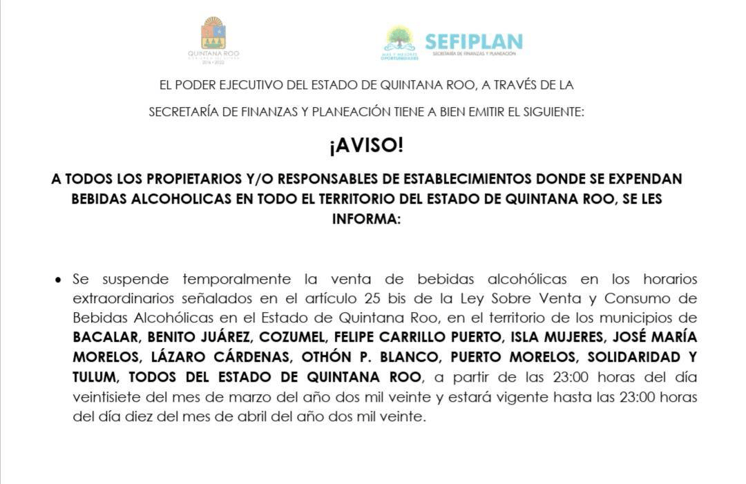 La medida, de acuerdo con la Sefiplan, suspende temporalmente la venta de bebidas alcohólicas en horarios extraordinarios señalados en el Artículo 25 bis de la Ley sobre venta y consumo de bebidas alcohólicas en Quintana Roo.