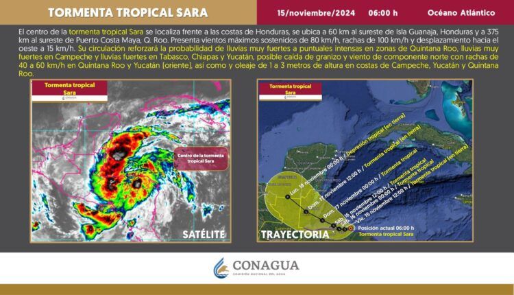 El centro de la tormenta tropical Sara se localiza actualmente a 60 kilómetros al sureste de Isla Guanaja, Honduras, y a 375 kilómetros al sureste de Puerto Costa Maya, Quintana Roo. Según la Comisión Nacional del Agua (Conagua), el sistema presenta vientos máximos sostenidos de 80 km/h, rachas de hasta 100 km/h, y avanza hacia el oeste a una velocidad de 15 km/h.
