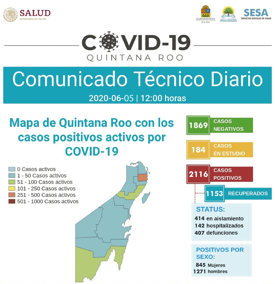 La Secretaria de Salud del Estado de Quintana Roo señaló en su reporte diario que hasta las 12 horas del 05 de junio, se han notificado 1869 casos negativos, 184 en estudio, 2116 positivos, 407 defunciones y 1153 personas recuperadas a COVID-19.