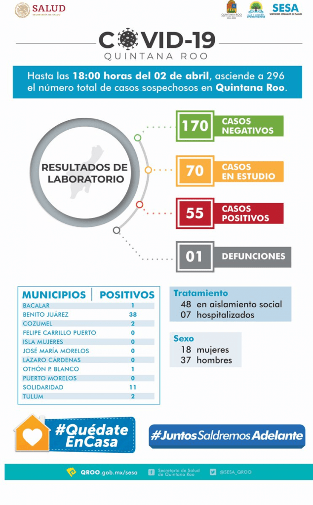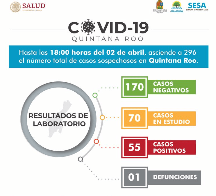 Con corte a las 18:00 horas, el panorama del Covid-19 en el estado de Quintana Roo reportado por la Secretaria de Salud Alejandra Aguirre es el siguiente: