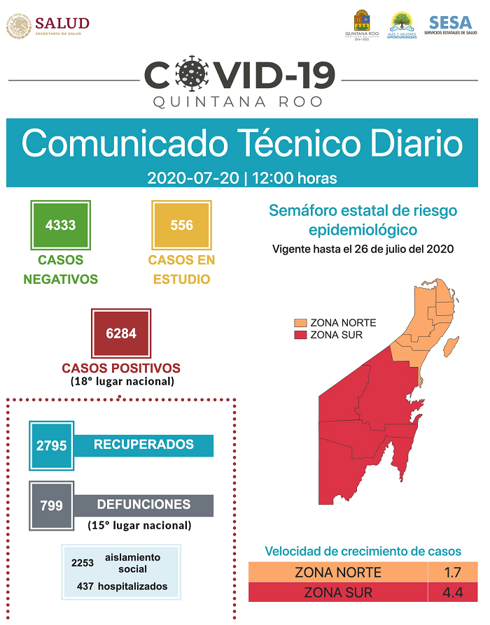 Informó Alejandra Aguirre, secretaria de salud de Quintana roo, que hasta las 12 horas del 20 de julio, se han notificado 2 mil 795 personas recuperadas, 4 mil 333 casos negativos, 556 casos en estudio, 6 mil 284 casos positivos y 799 defunciones relacionadas a COVID-19.