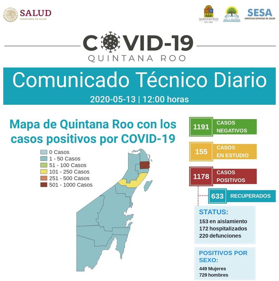 El panorama del Covid-19 en Quintana Roo hasta las 12 horas del 13 de mayo es el siguiente:  se han notificado 1191 casos negativos, 155 en estudio, 1178 positivos, 220 defunciones y 633 personas recuperadas a COVID-19.