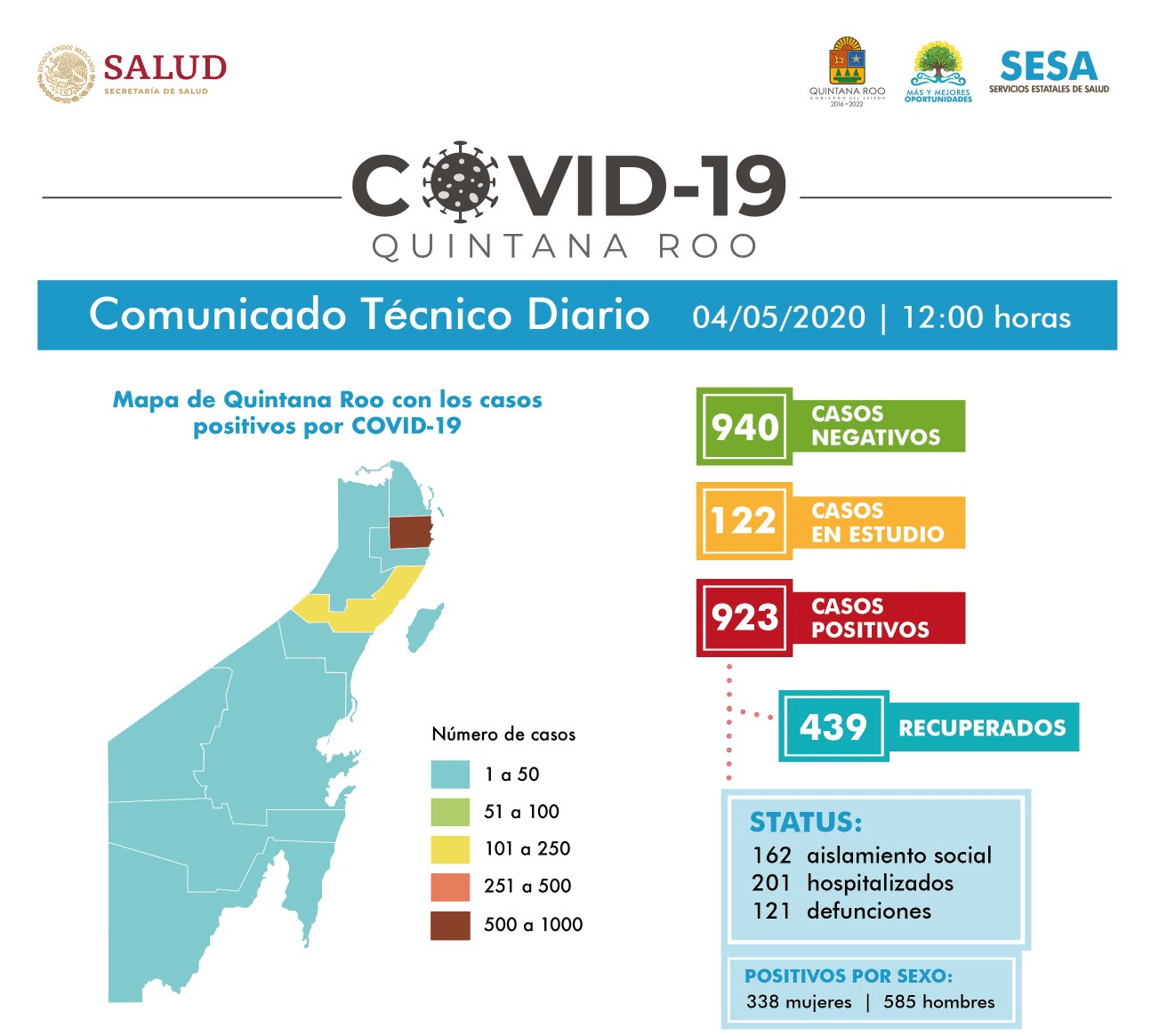 Hasta las 12 horas del 4 de mayo, se han notificado 940 casos negativos, 122 en estudio, 923 positivos, 121 defunciones y 439 personas recuperadas a COVID-19. Esto lo informó la secretaria de salud del estado de Quintana Roo Alejandra Aguirre.