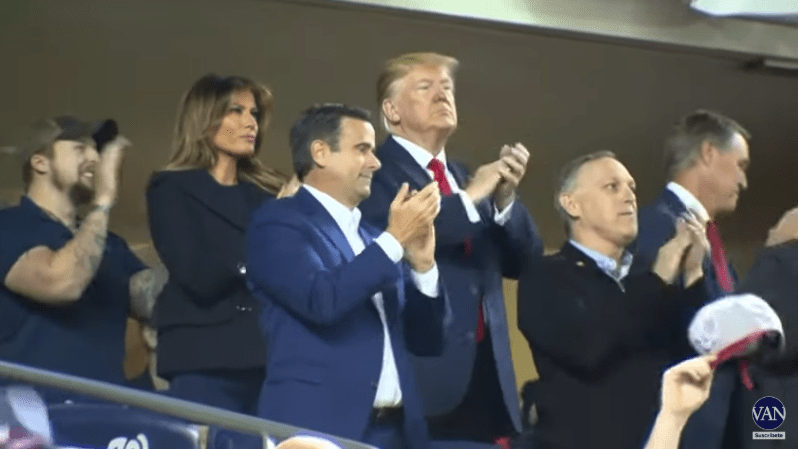 Se mostró inmediatamente después la imagen de Trump y su comitiva, mientras se anunciaba en los altavoces del estadio la presencia del presidente. Las aclamaciones se convirtieron en una andanada de abucheos.