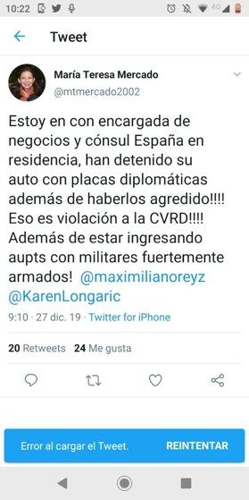 En un tuit, que posteriormente fue eliminado, la Embajadora María Teresa Mercado indicó que a los alrededores del inmueble habían arribado automóviles militares “fuertemente armados”.