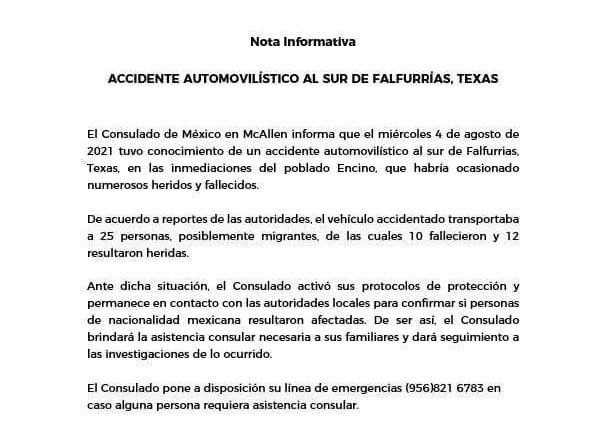 El Consulado de México en McAllen Texas confirmó que tres mexicanos fallecieron entre las diez personas que perdieron la vida en la volcadura de una camioneta a la altura del poblado de encino, en el condado de Brooks, el miércoles.