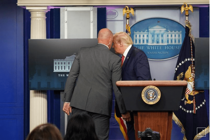 Un agente del servicio secreto de Estados Unidos interrumpió y sacó a Donald Trump de la sala de prensa de la Casa Blanca mientras habla con medios de comunicación.