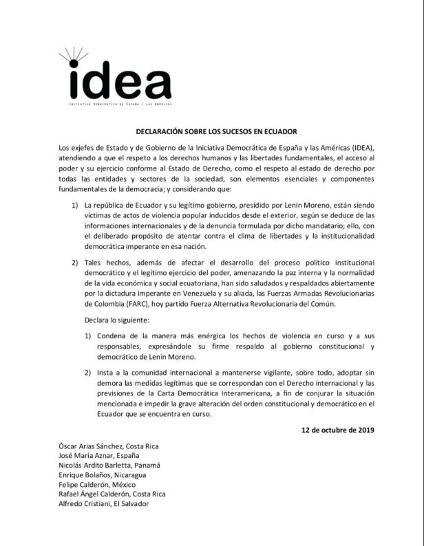 Los ex-presidentes de México Felipe Calderón Hinojosa y Vicente Fox Quezada, firmaron junto con 18 ex-mandatarios de España y América un documento en que avalan las acciones que el presidente de Ecuador Lenin Moreno ha emprendido, incluyendo un toque de queda en Quito que busca inhibir las protestas populares en contra de un paquete económico impuesto por el Fondo Monetario Internacional.