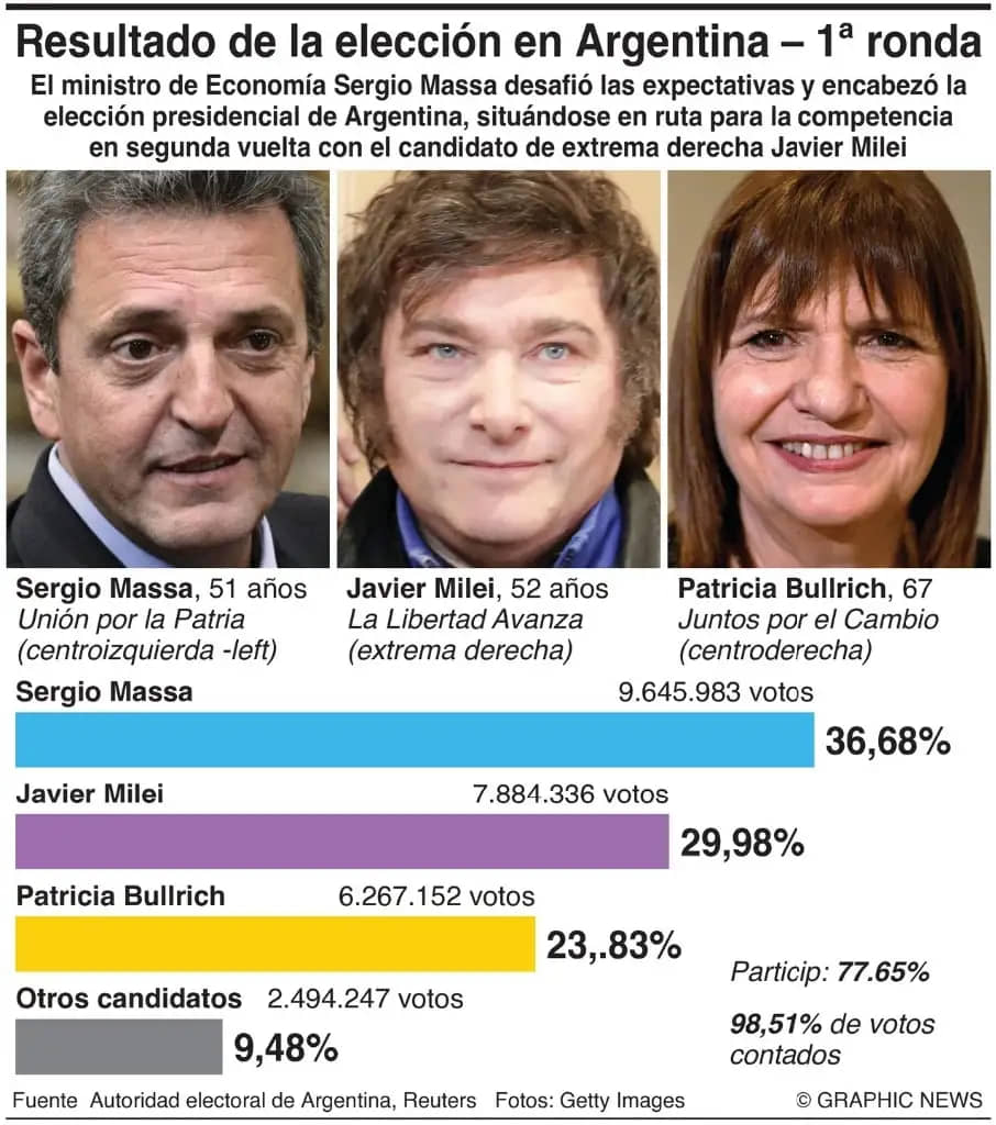 Buenos Aires. El candidato a la presidencia de la fuerza oficialista Unión por la Patria, Sergio Massa, resultó el más votado en todo el país y se imponía anoche en las elecciones presidenciales celebradas este domingo con 36.6 por ciento de votos, seguido por Javier Milei, de la ultraderechista La Libertad Avanza, que alcanzó 30.1 puntos, con escrutinio de 96.9 por ciento, lo que lleva a una segunda vuelta que se realizará el 19 de noviembre.